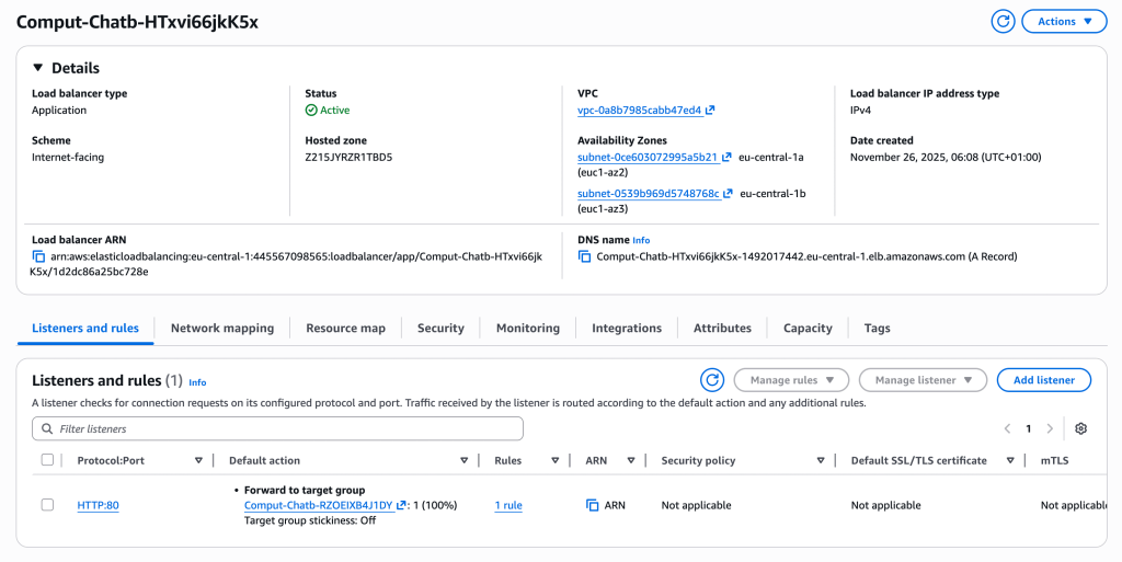 - Application Load Balancer — receives incoming HTTP requests and routes them to the healthy ECS tasks.