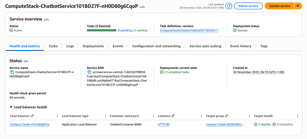 - ECS Service (two tasks) — keeps two running copies of the application container and handles task replacement and health checks.